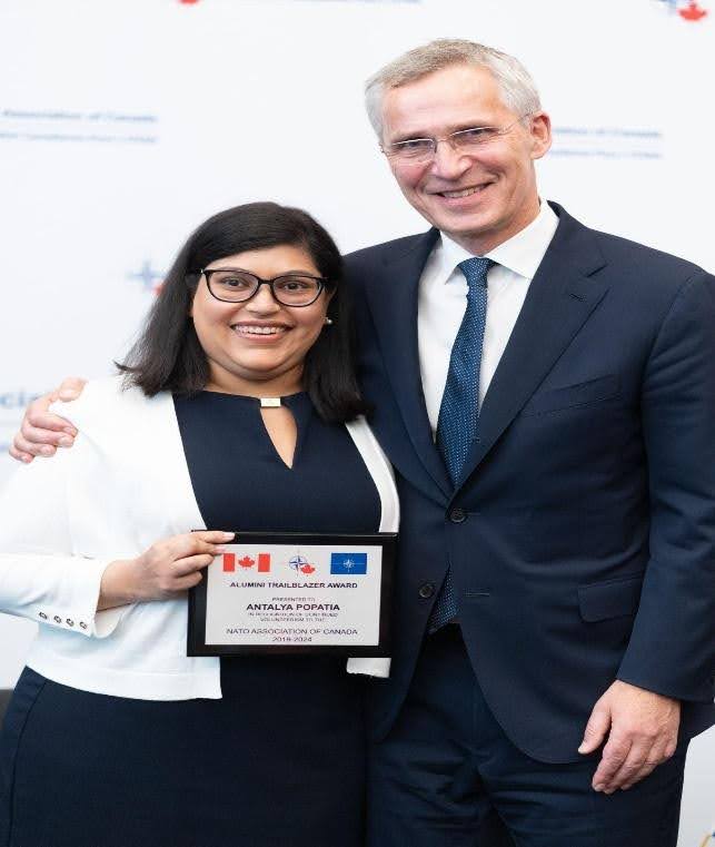As part of the event, NATO Secretary General Jens Stoltenberg and her long-time mentor, President of the NATO Association Robert Baines, presented Antalya Popatia with the NATO Intern Alumni Trailblazer Award in recognition of five years of invaluable volunteer work for the NATO Association of Canada.