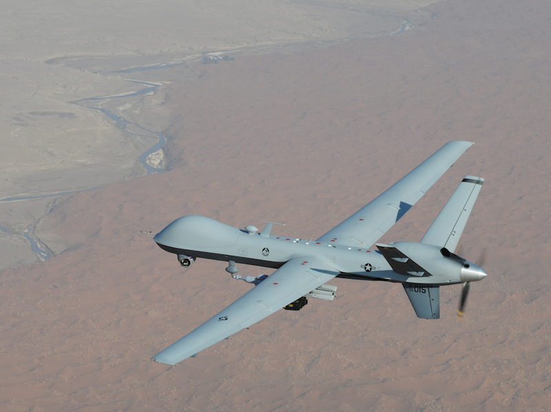 Photo: MQ-9 Reaper unmanned aerial vehicle flies a combat mission over southern Afghanistan, by U.S. Air Force Lt. Col. Leslie Pratt via Wikimedia. Public Domain